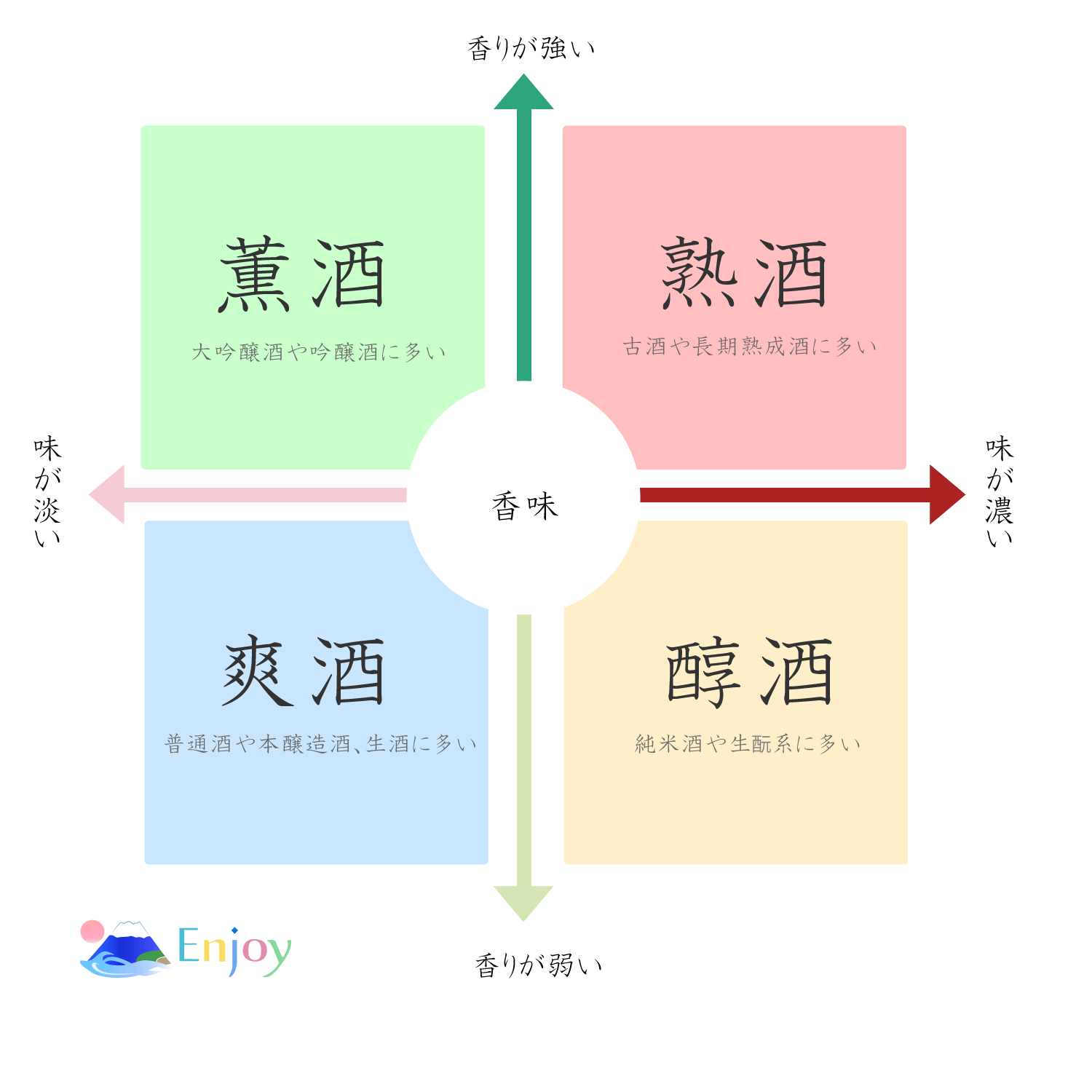 多彩な味わいを楽しめる日本酒ですが、香りの強弱や味の濃淡によって、大きく4種類に分けることが可能です。